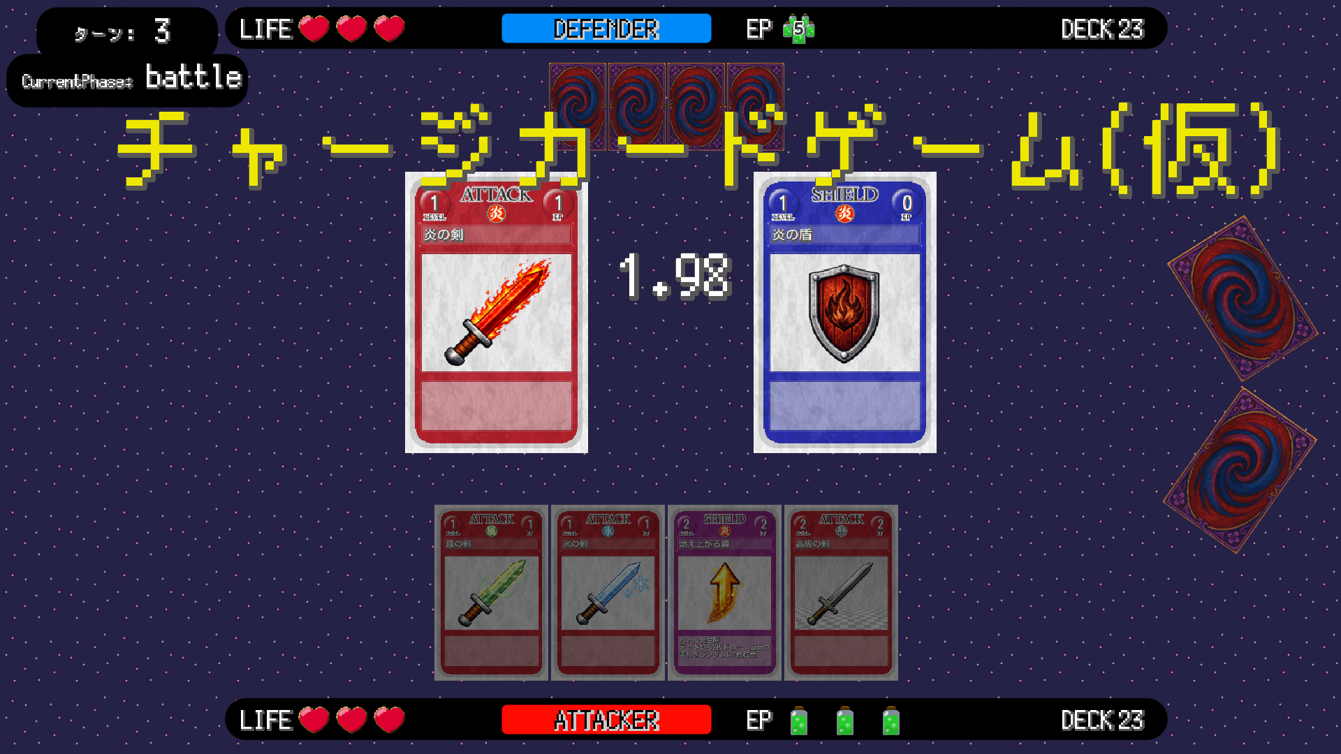 - HPは3、EPは3、手札は4枚でゲームが開始する