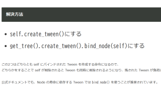 Godot4 で Tween を使う際、self.create_tween() と get_tree().create_tween() は同じではありません。Node に紐づくかどうかの違いと、削除時に注意したい安全な使い方を解説します。